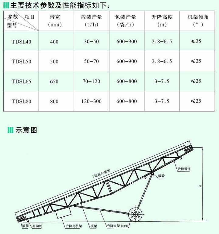 TDSL移動(dòng)式升降皮帶輸送機(jī)可以散、包兩用,可任意移動(dòng)作業(yè),室內(nèi)外均可使用,具有快、慢兩種速度,以適應(yīng)散運(yùn)、包運(yùn)的不同要求,提高設(shè)備利用率。機(jī)架采用鋼管彎曲或角鋼焊接而成,具有重量輕,移動(dòng)靈活的特點(diǎn)。升降方式有手動(dòng)或機(jī)動(dòng)兩種,升降靈活方便,通過操作升降機(jī)械,可以調(diào)節(jié)輸送機(jī)的傾角及卸料點(diǎn)的高度。